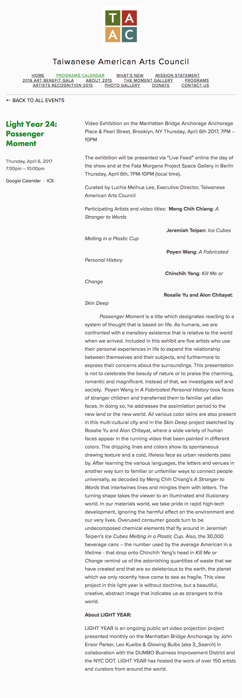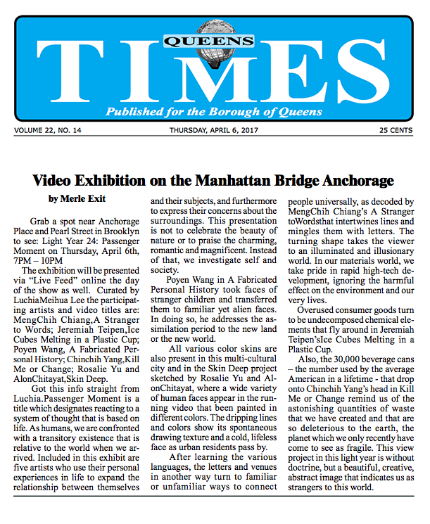 The exhibition will be presented via “Live Feed” online the day of the show as well. Curated by LuchiaMeihua Lee the participating artists and video titles are: MengChih Chiang,A Stranger to Words; Jeremiah Teipen,Ice Cubes Melting in a Plastic Cup; Poyen Wang, A Fabricated Personal History; Chinchih Yang,Kill Me or Change; Rosalie Yu and AlonChitayat,Skin Deep.