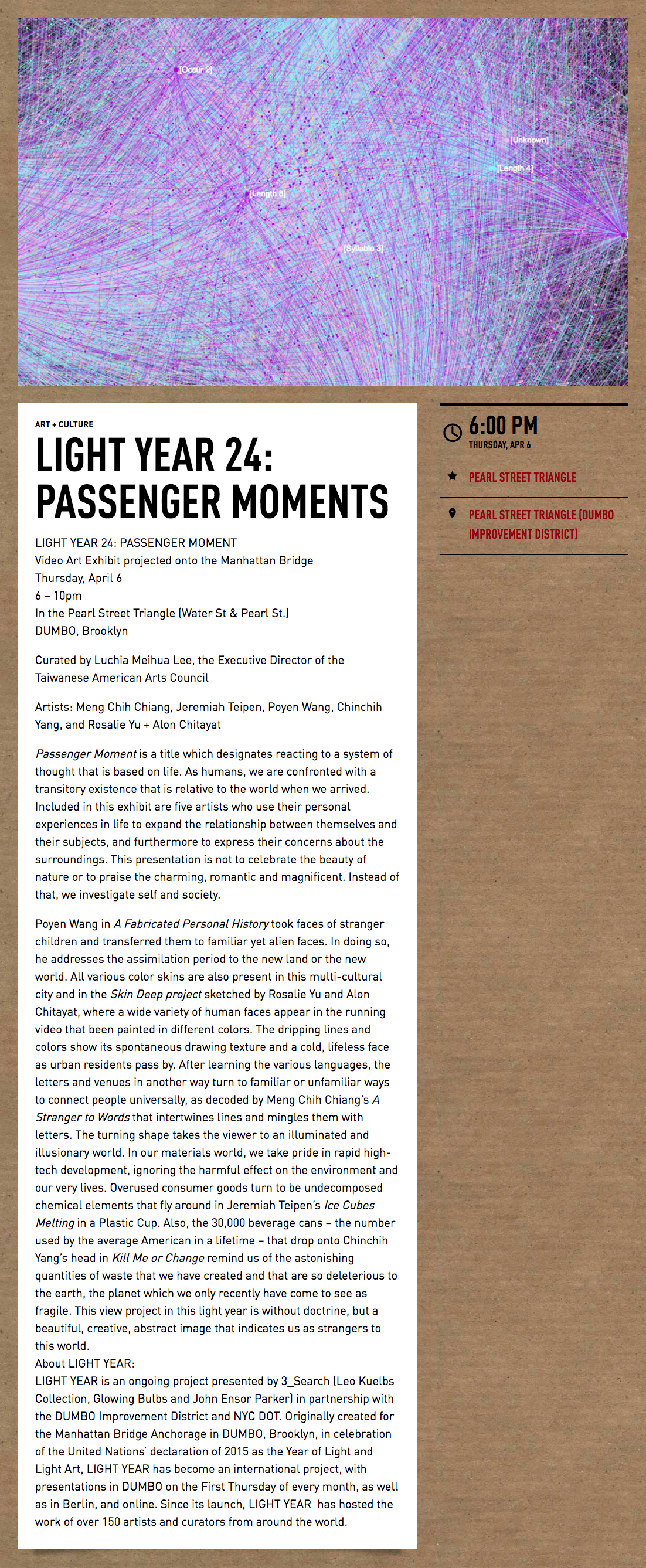 Grab a spot near Anchorage Place and Pearl Street in Brooklyn to see: Light Year 24: Passenger Moment on Thursday, April 6th, 7PM – 10PM