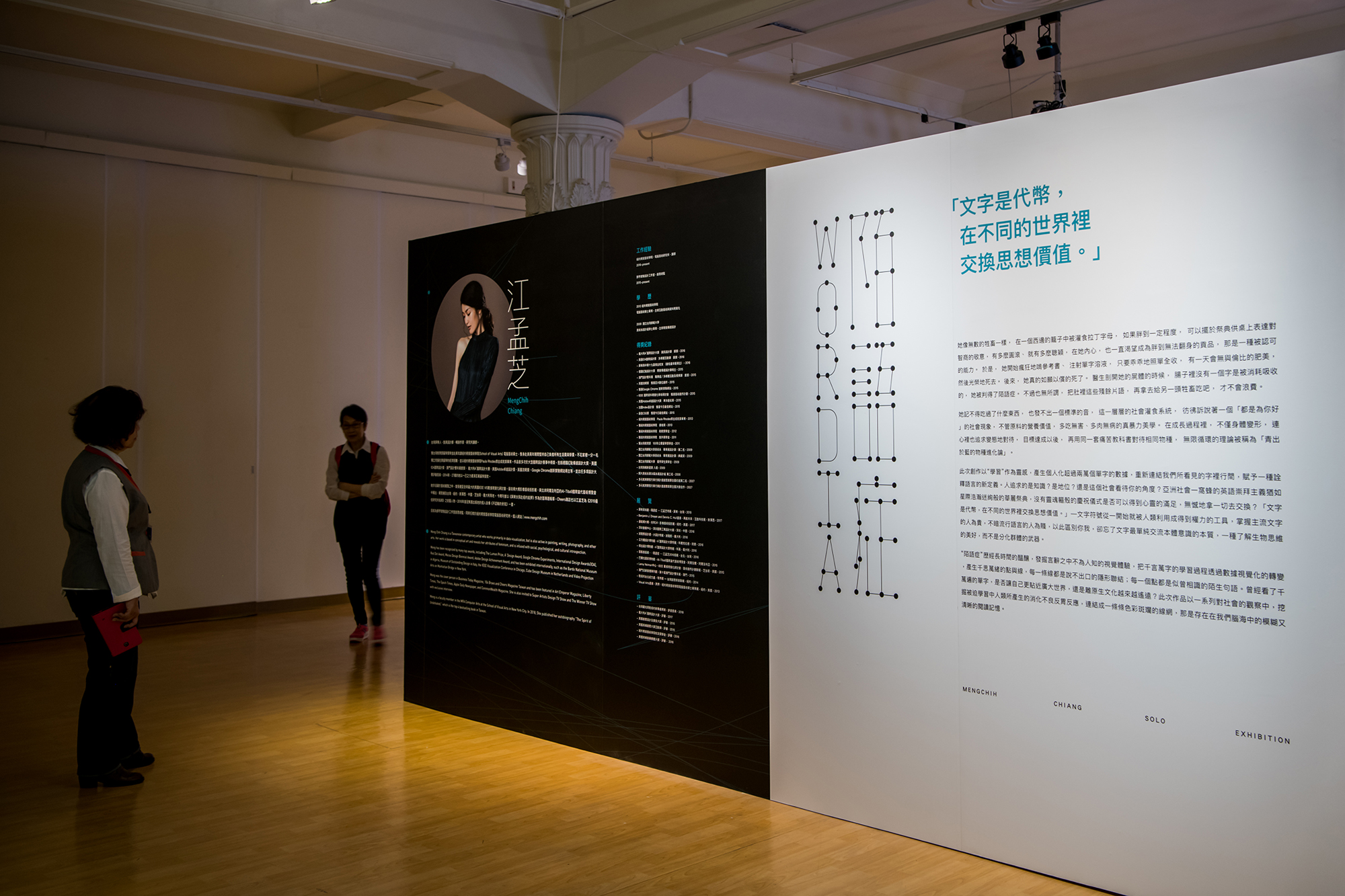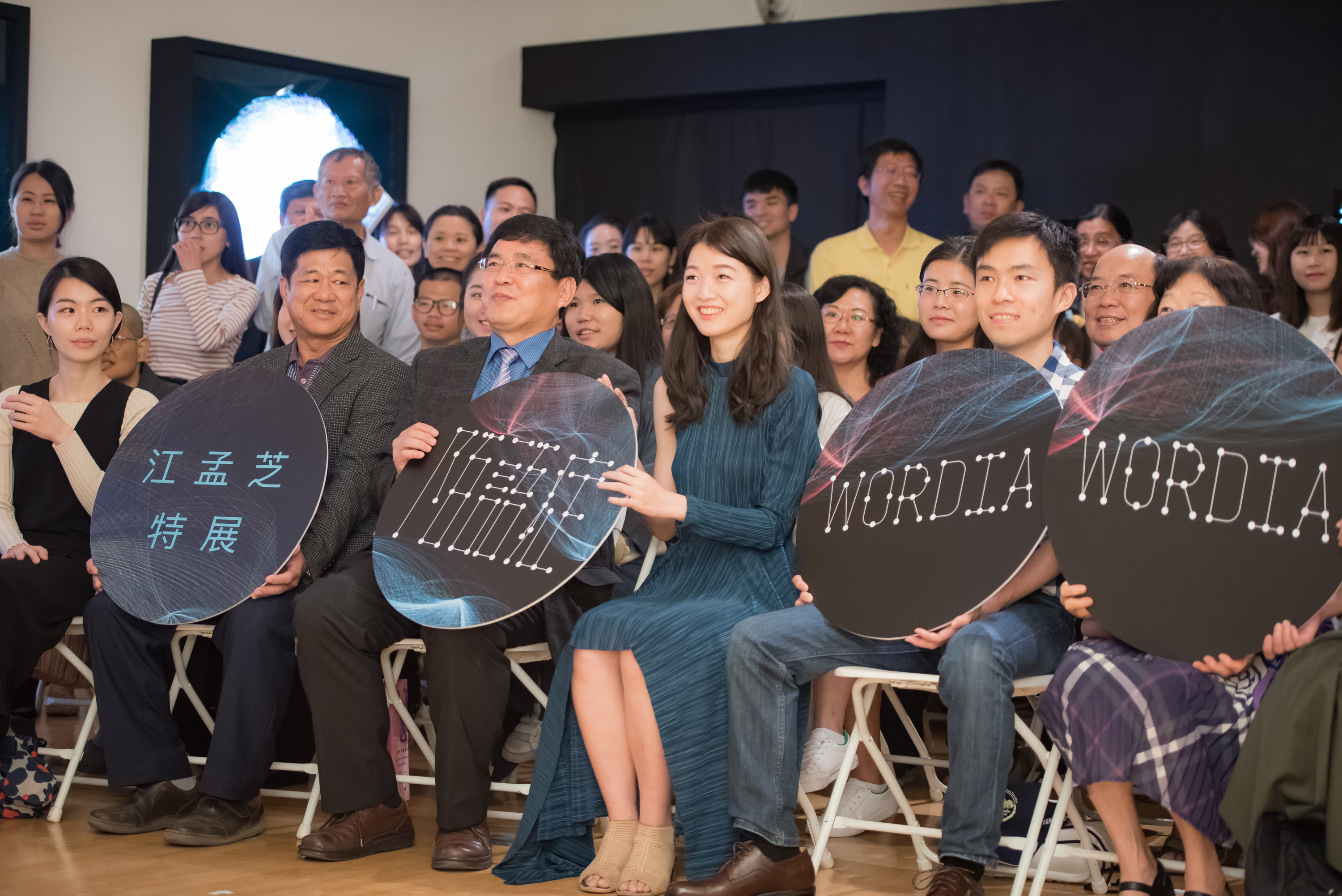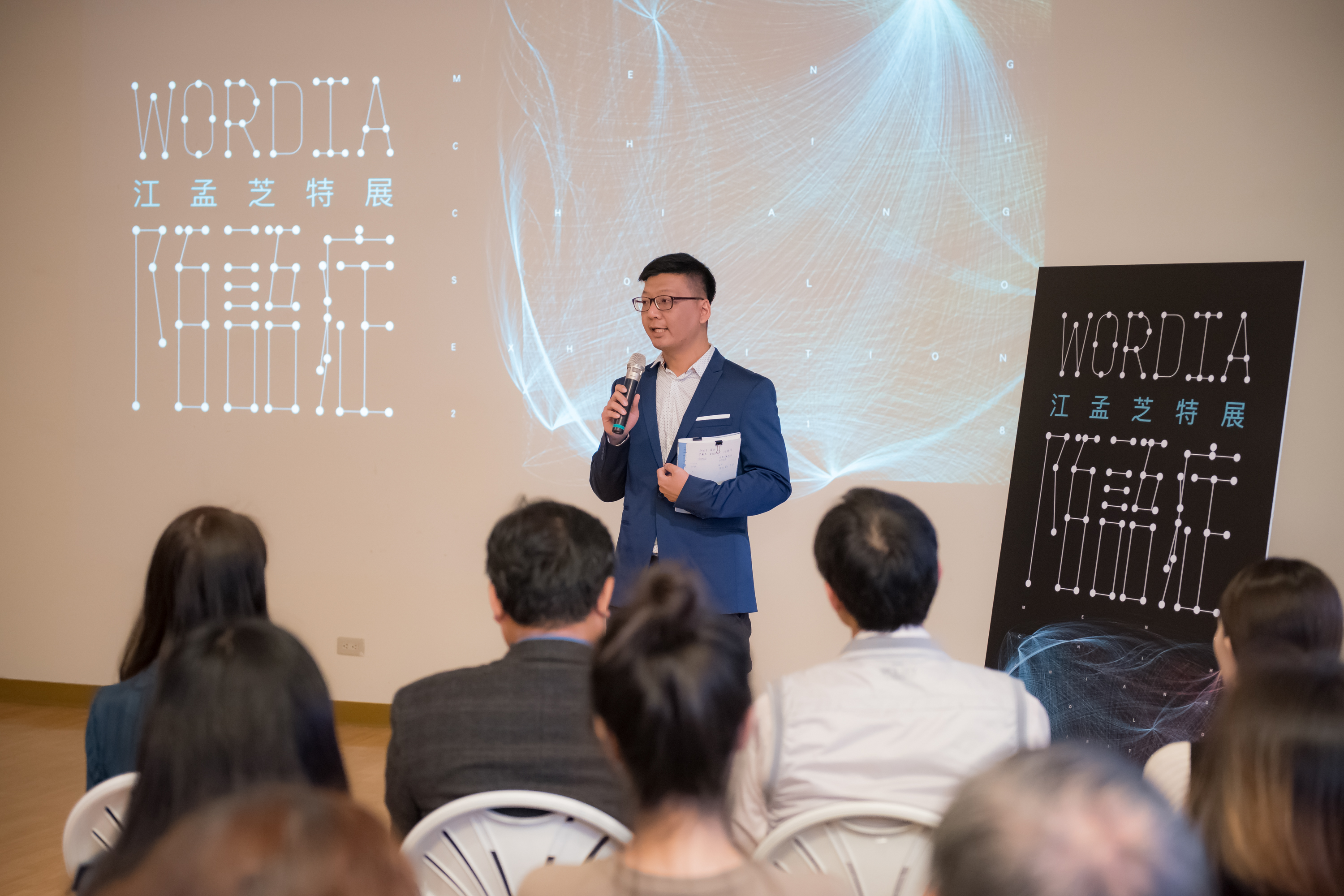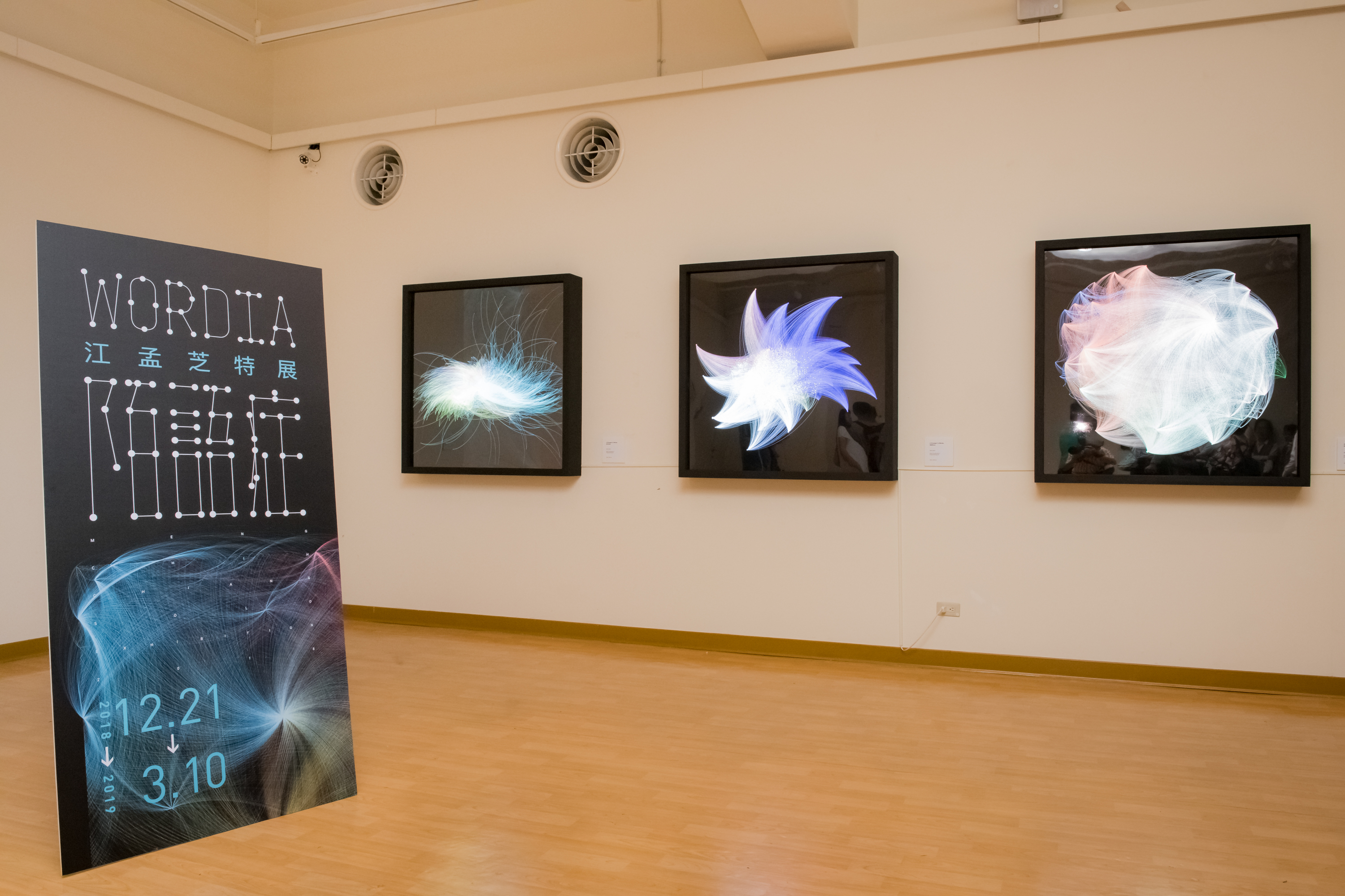 江孟芝說,《陌語症WORDIA》是她初到紐約求學時,將自己閱讀報章雜誌累積的2萬多個單字為素材,透過程式設計依音節長短作整理、運算,呈現如宇宙中炫麗的星象般的圖騰,千思萬緒的點與線也串連自己在異鄉生活的故事。