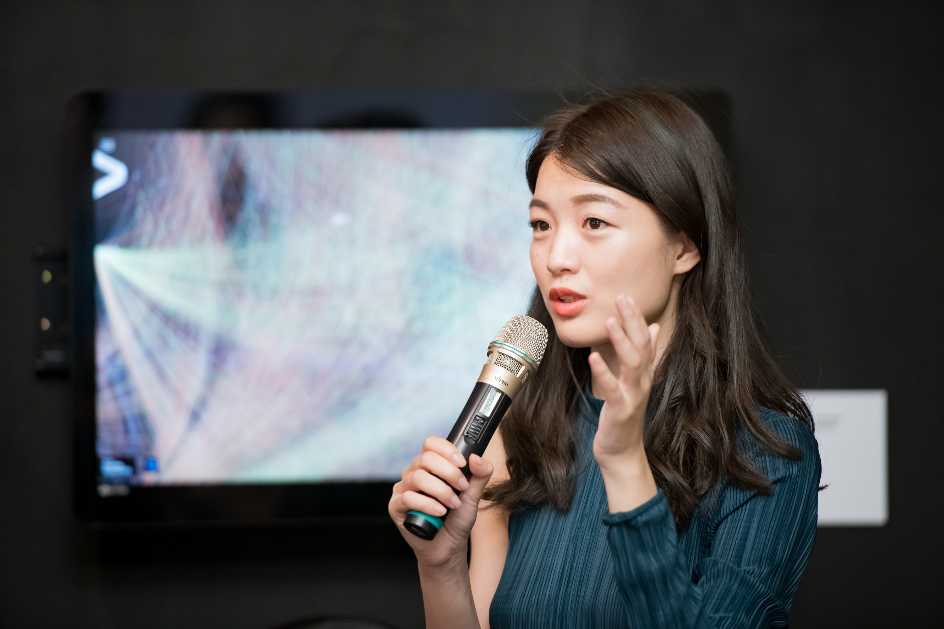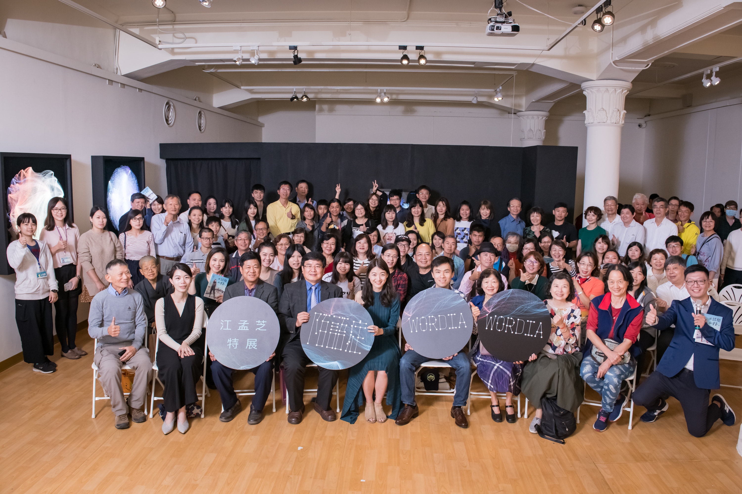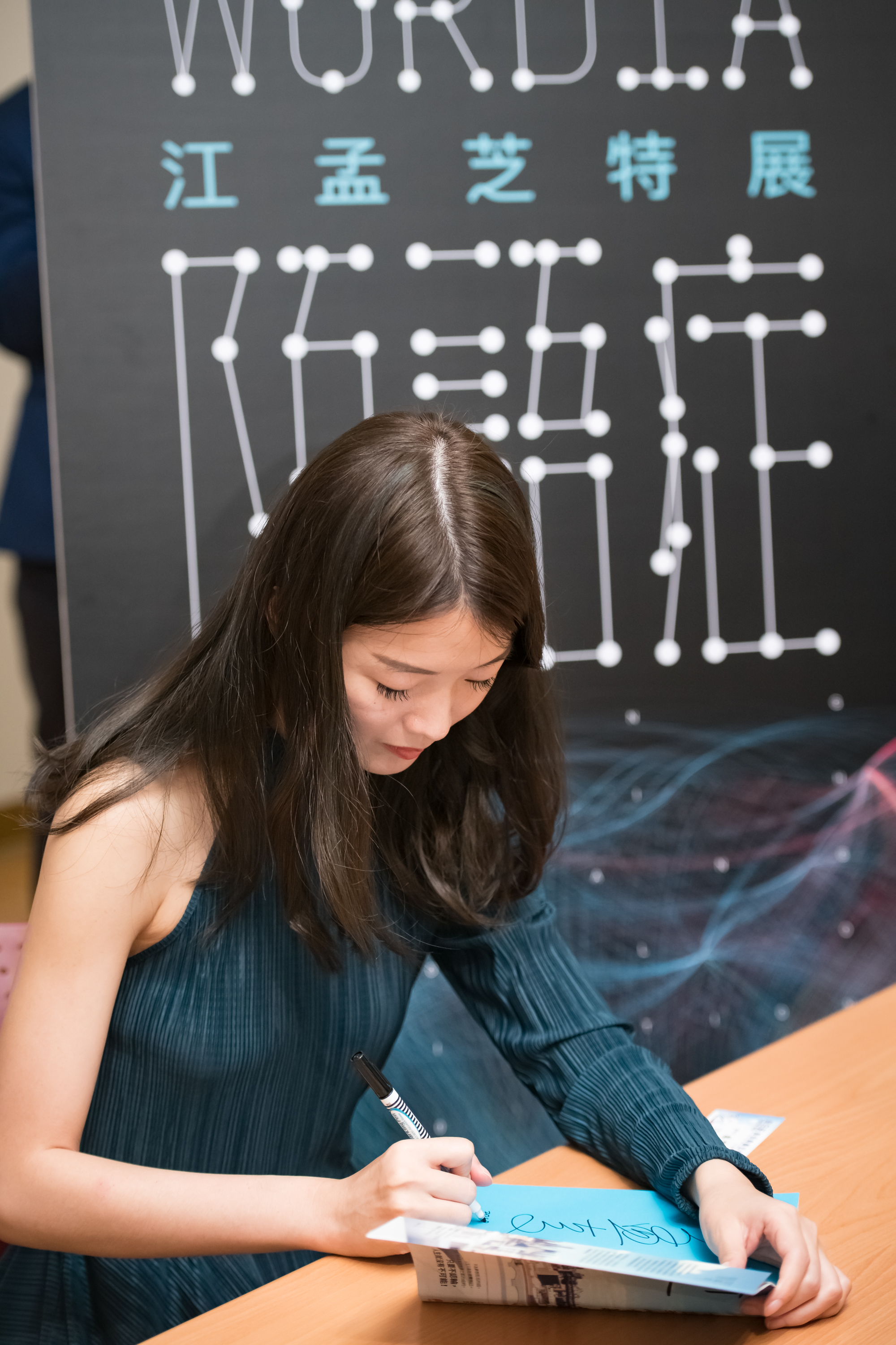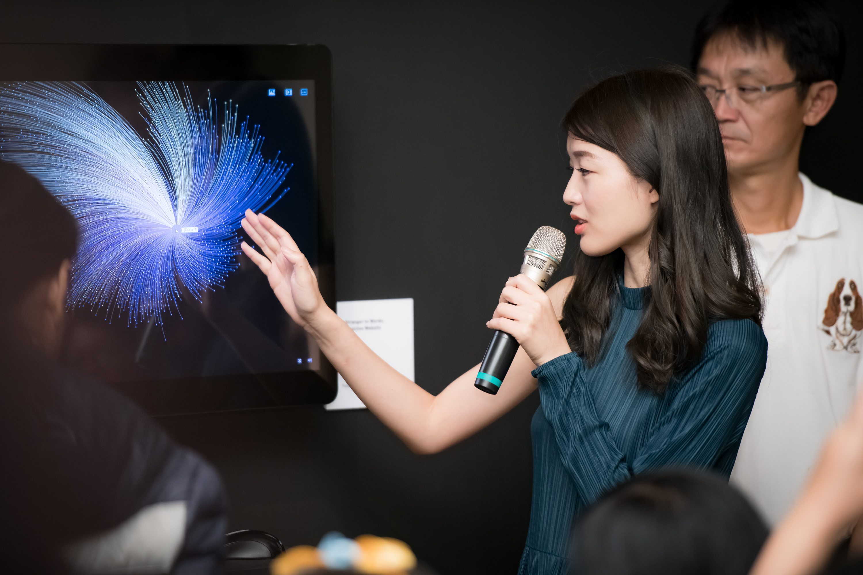 江孟芝說,《陌語症WORDIA》是她初到紐約求學時,將自己閱讀報章雜誌累積的2萬多個單字為素材,透過程式設計依音節長短作整理、運算,呈現如宇宙中炫麗的星象般的圖騰,千思萬緒的點與線也串連自己在異鄉生活的故事。