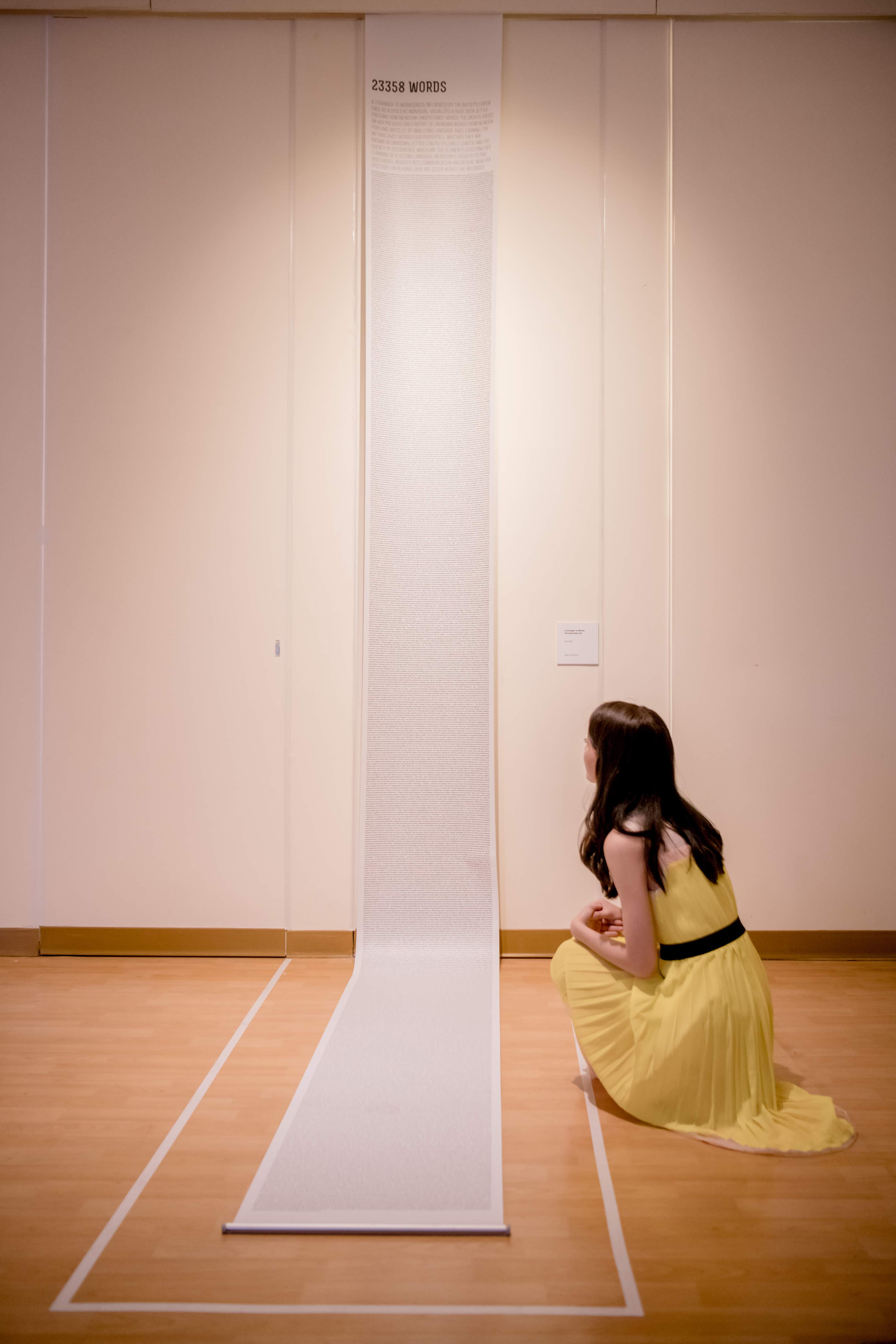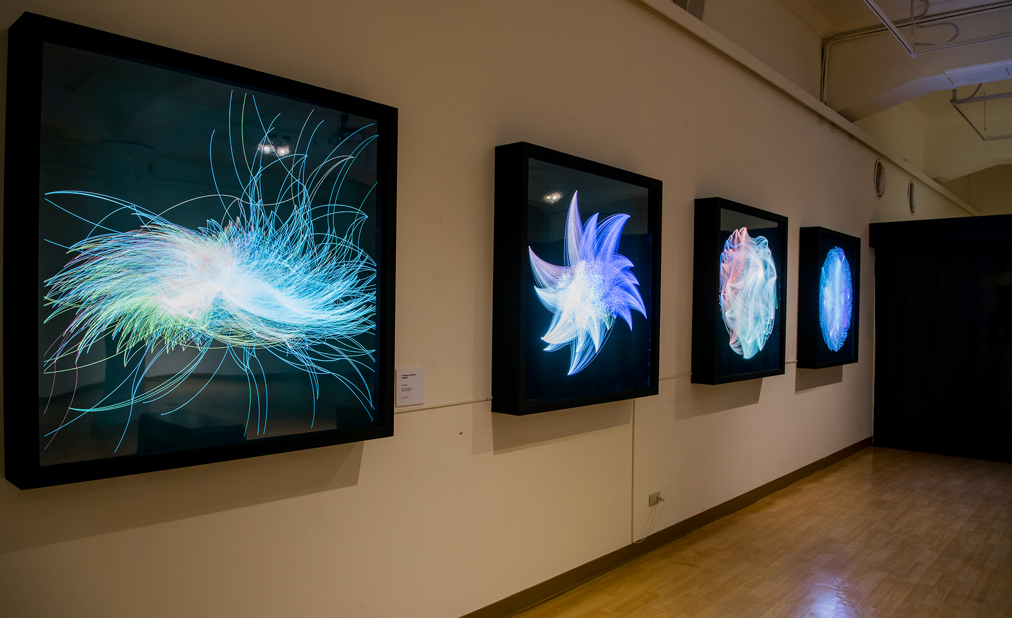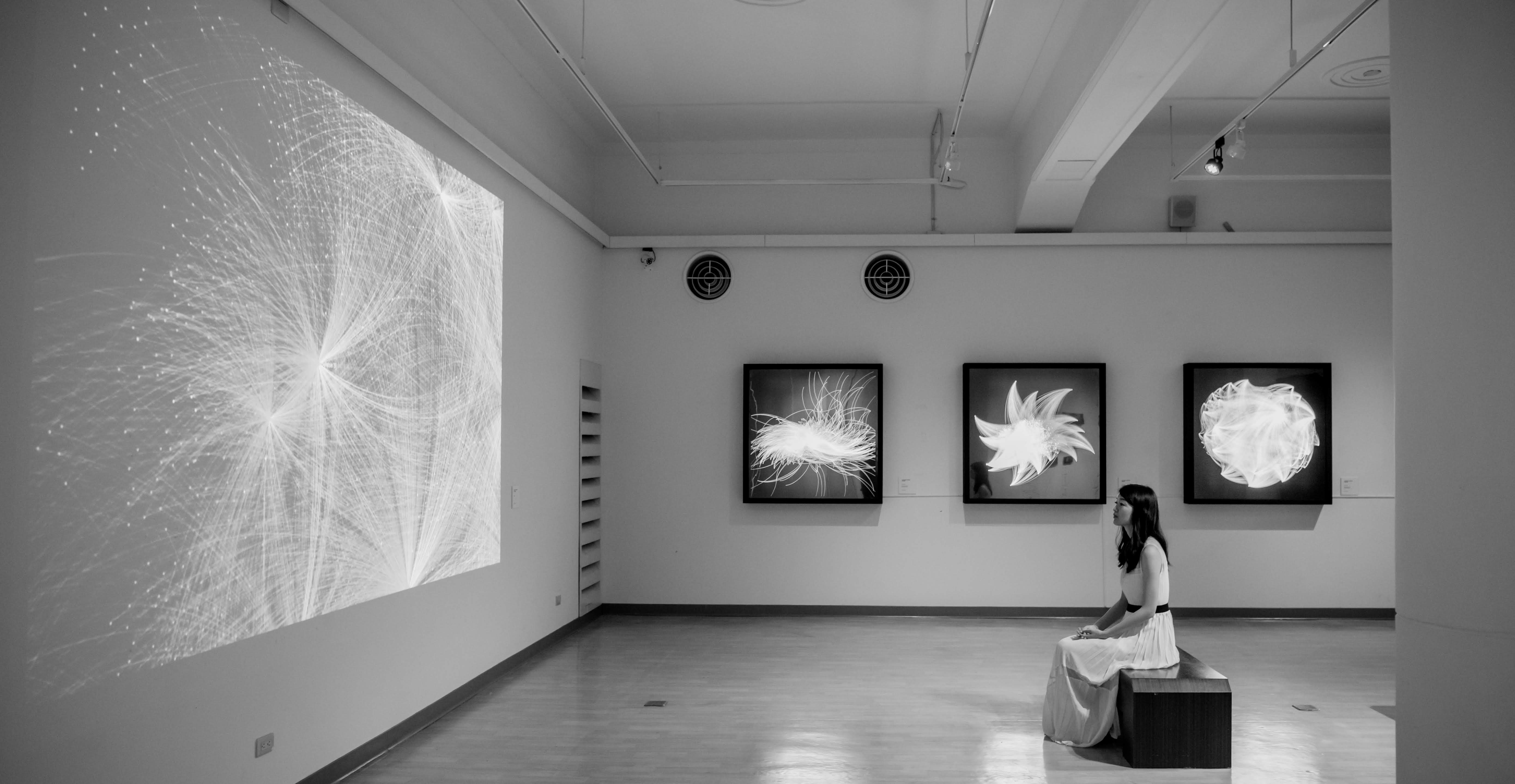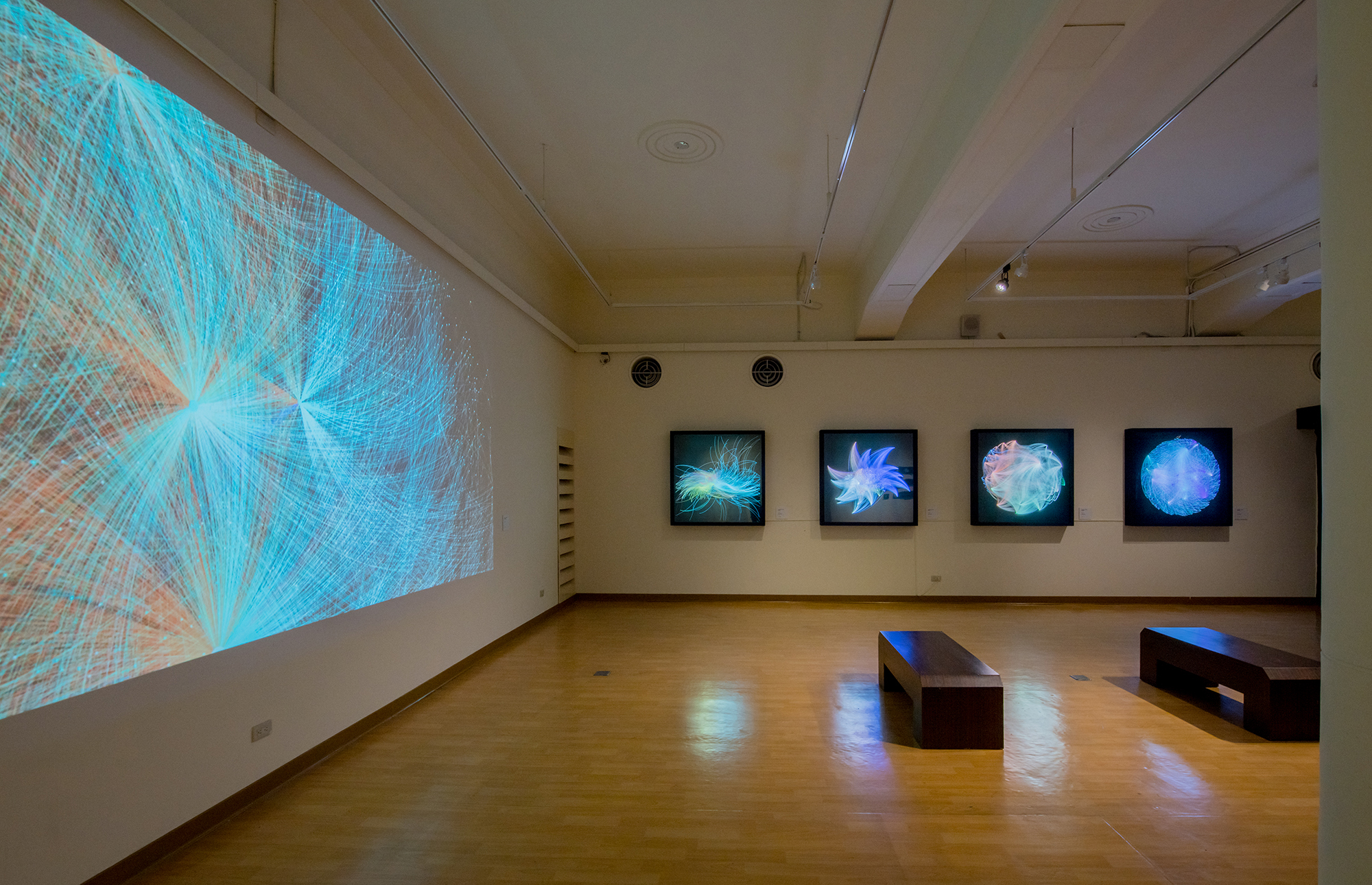 江孟芝說,《陌語症WORDIA》是她初到紐約求學時,將自己閱讀報章雜誌累積的2萬多個單字為素材,透過程式設計依音節長短作整理、運算,呈現如宇宙中炫麗的星象般的圖騰,千思萬緒的點與線也串連自己在異鄉生活的故事。