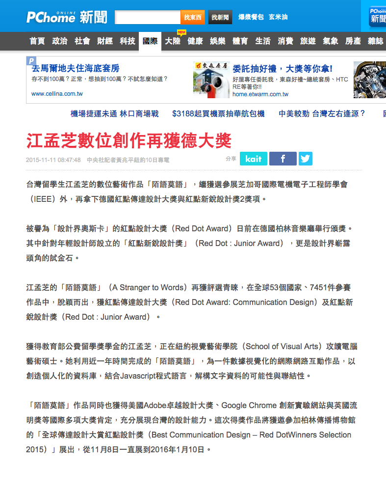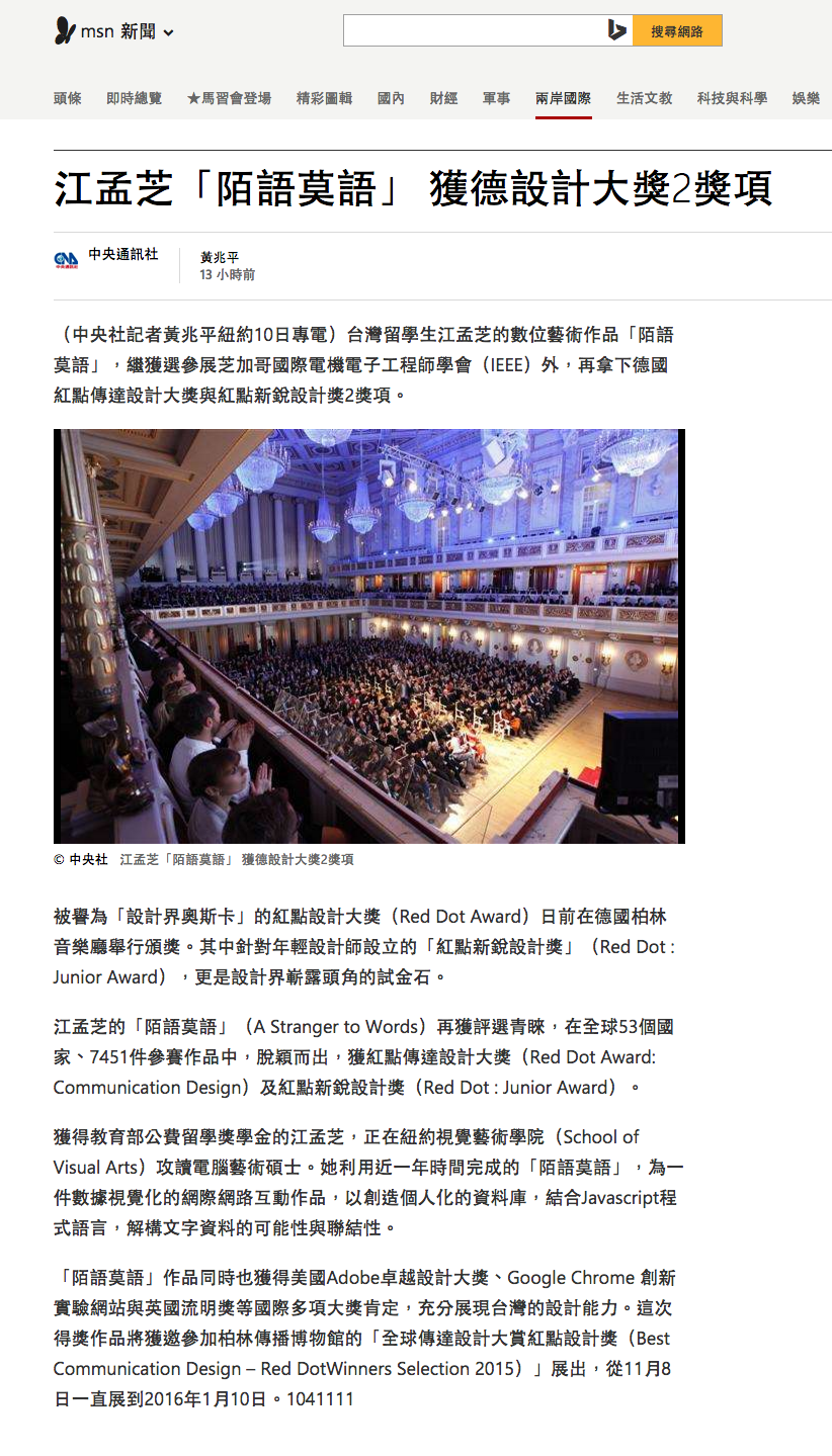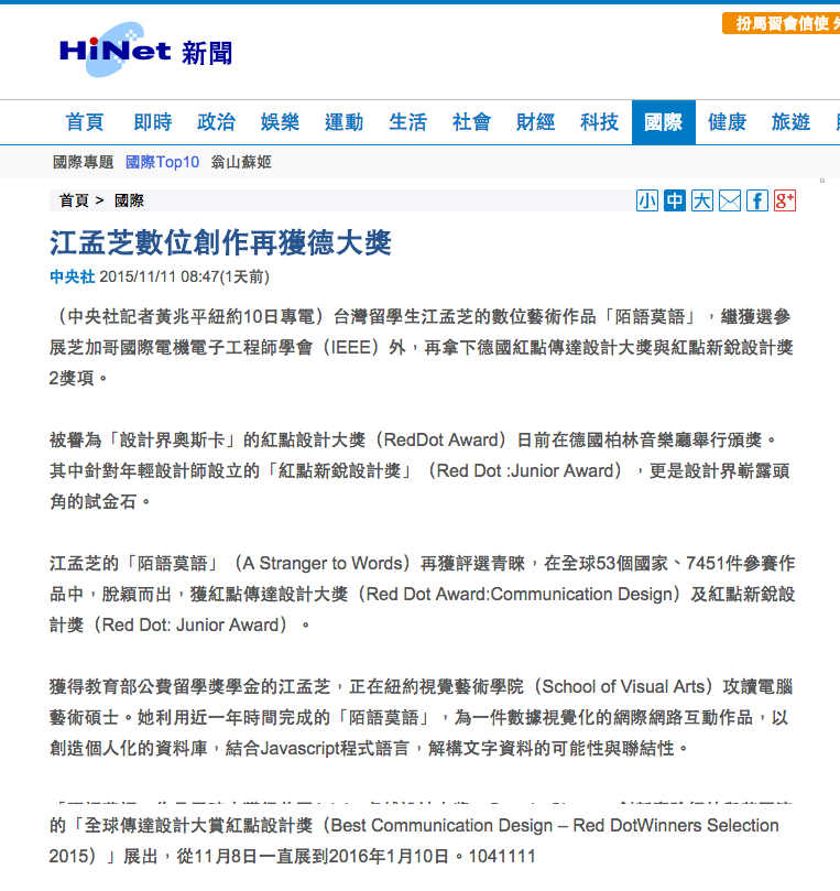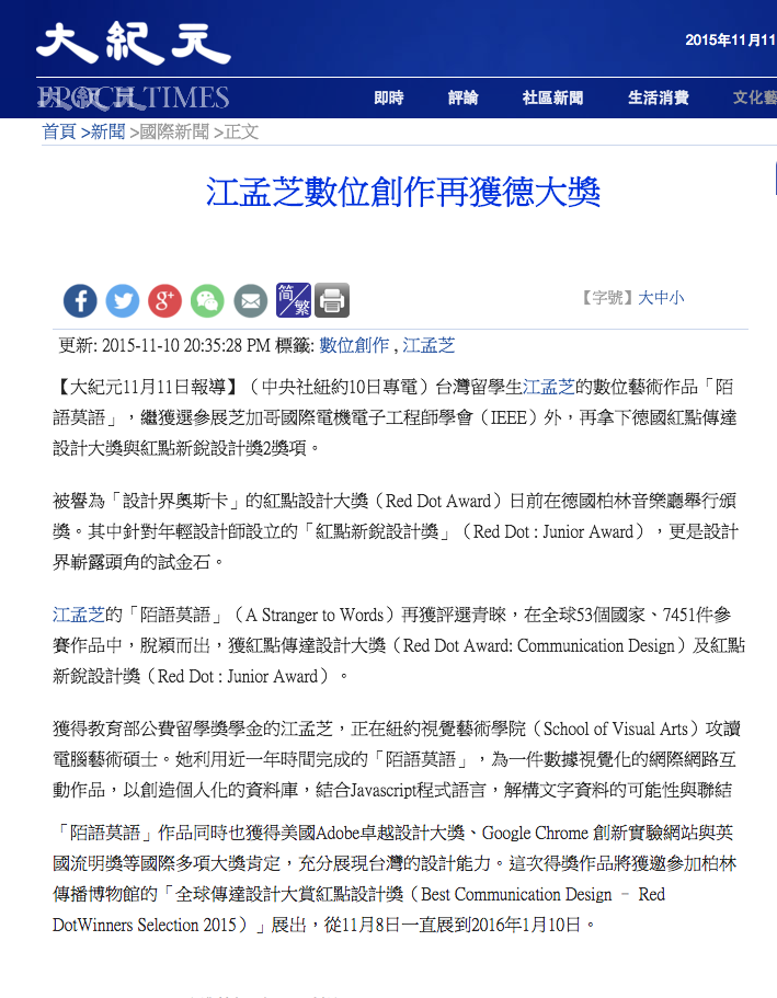 “A Stranger to Words” an interactive data visualization created by Taiwanese designer, Meng Chih Chiang has not only selected to The IEEE VIS 2015 Arts Program but also won 2 titles of the Red Dot Award: Communication Design Winner and Junior Award last week in Berlin.
