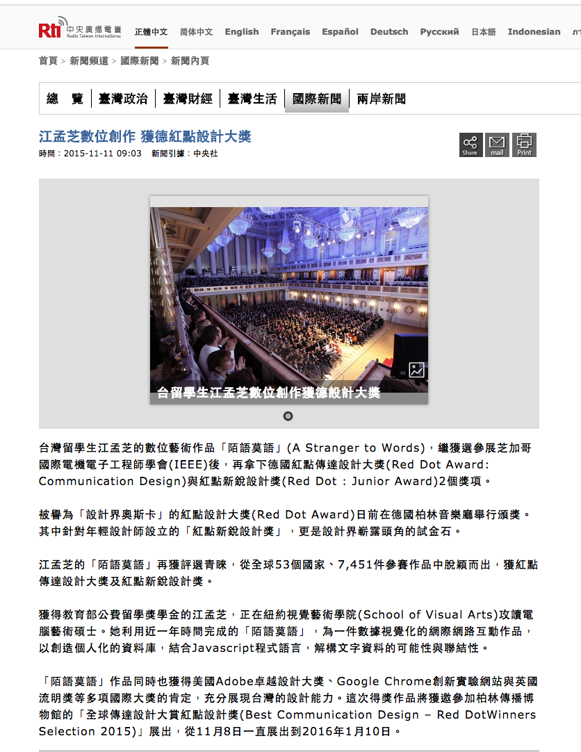 “A Stranger to Words” is also honored by Adobe Design Achievement Awards, Google Chrome Experiments Site in United State and The Lumen Prize in England which strong presents the design ability from Taiwan. All award-winning projects of the Red Dot will showcase in an exhibition entitled “Best Communication Design – Red Dot Winners Selection 2015” at the Museum für Kommunikation Berlin from 8 November 2015 to 10 January 2016.